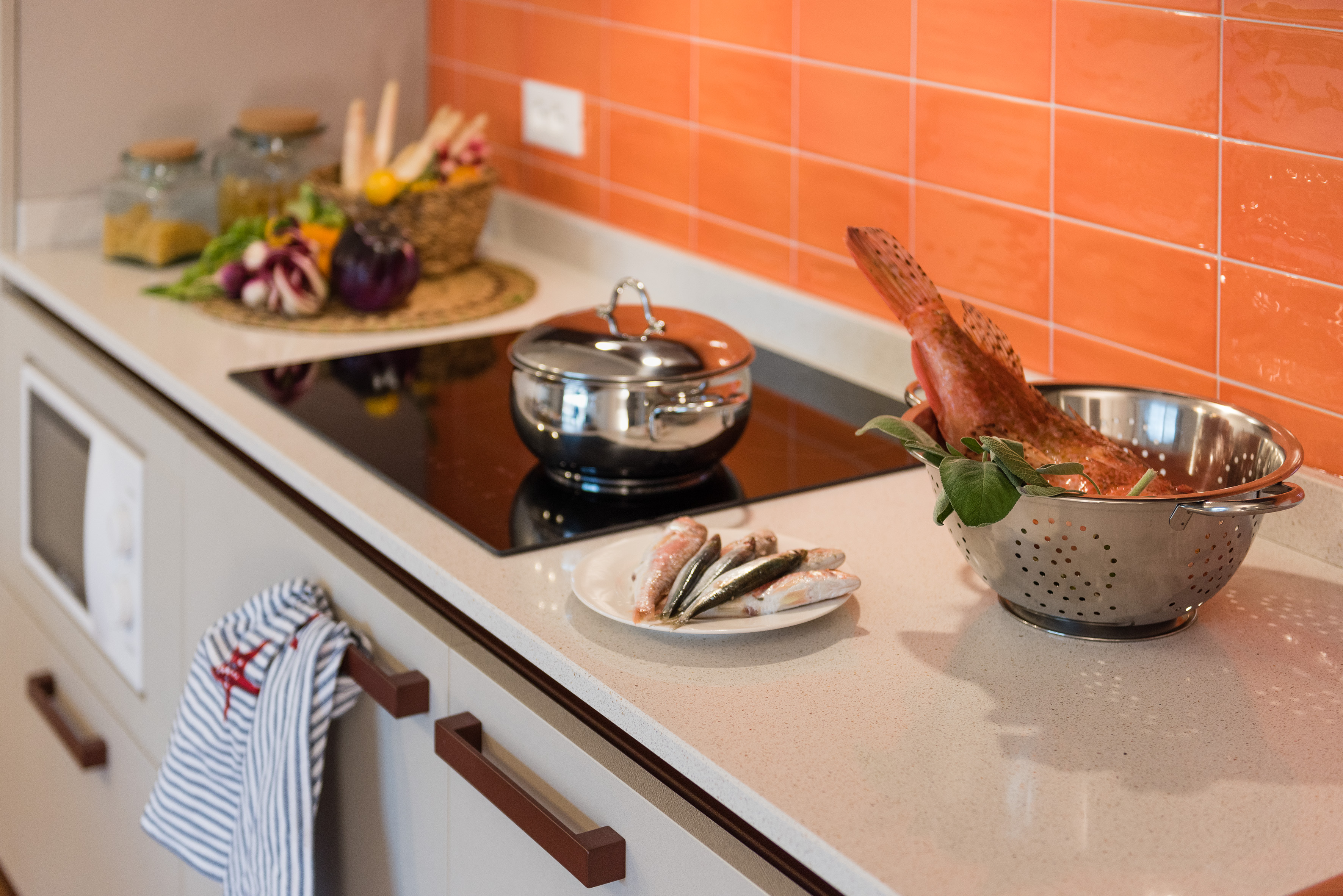 – Angolo cottura con piano in vetroceramica ad induzione, accessoriato con frigorifero, forno a microonde, moka, macchina da caffè americano