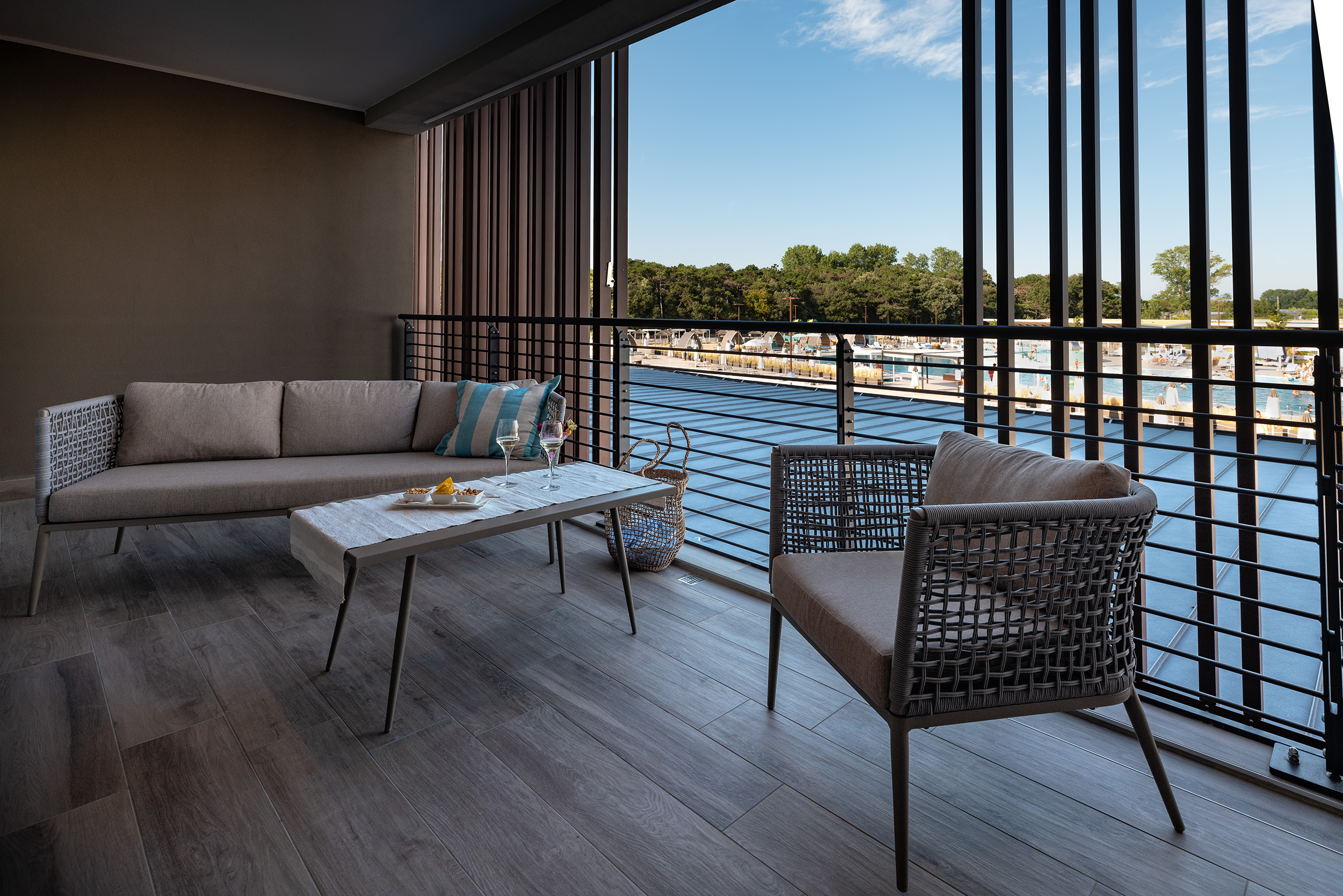 – Möblierter überdachter Balkon (17,50 m²) mit Blick auf den Pool- und Gartenbereich;